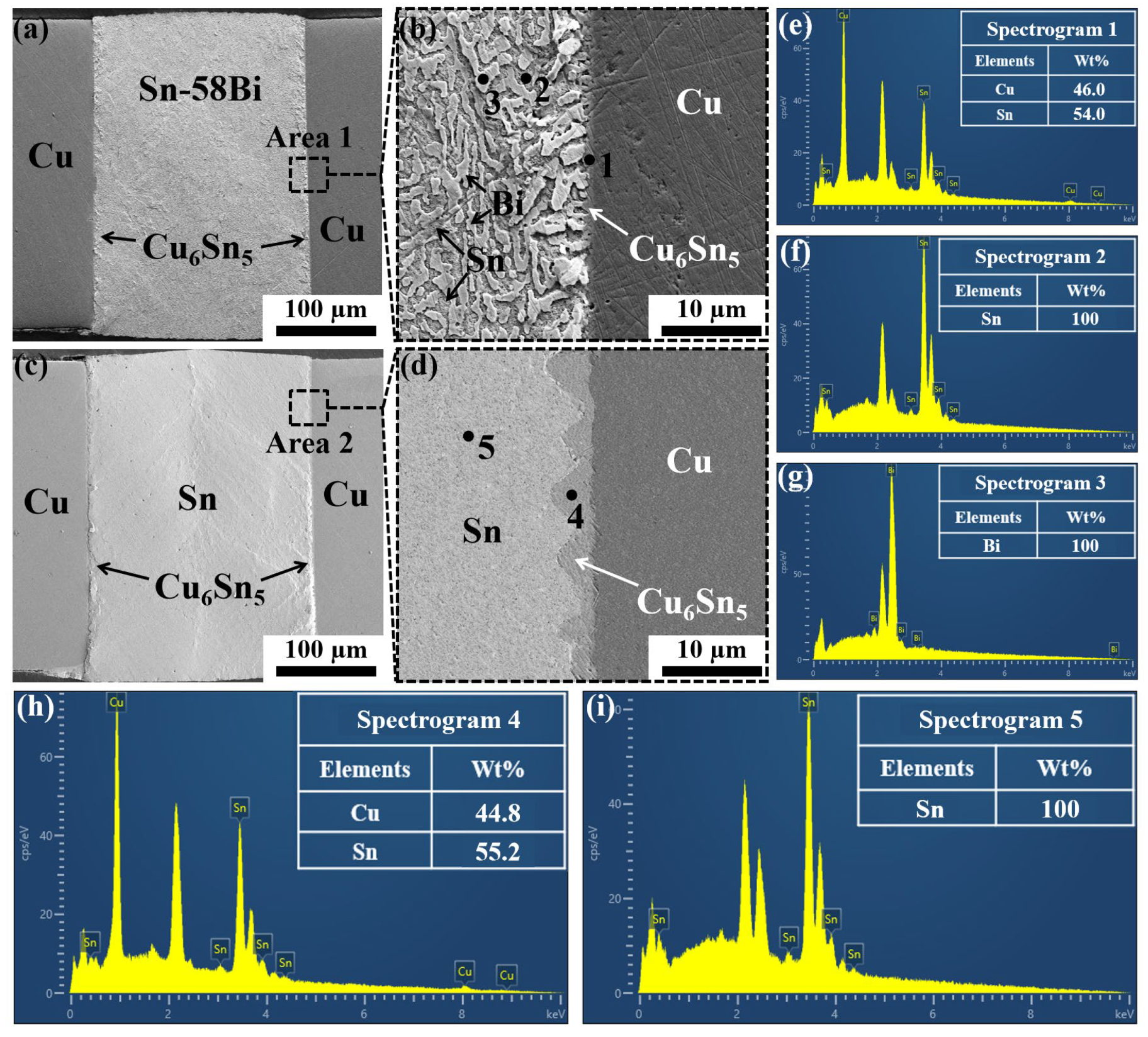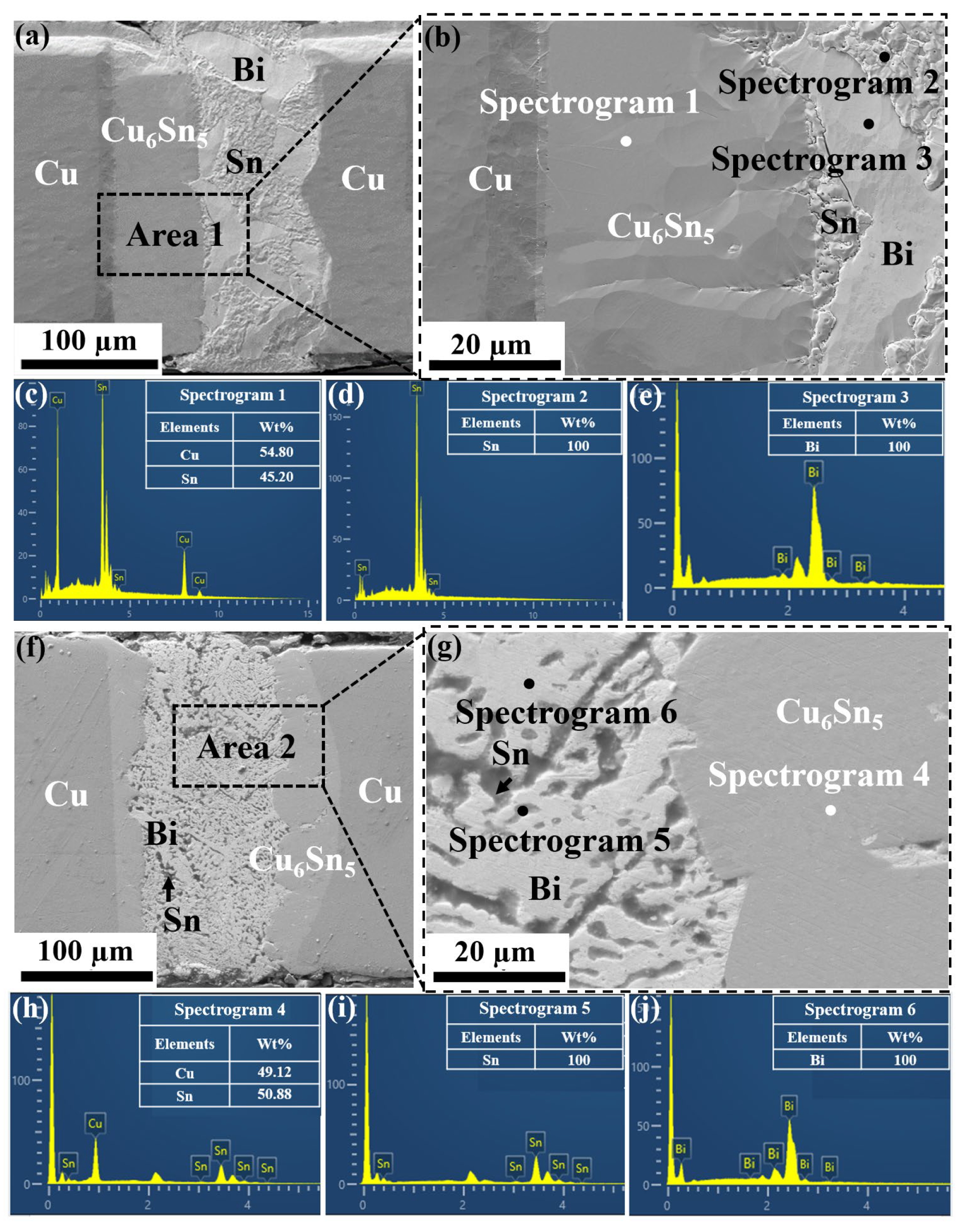 3.2.1. SEM Results Analysis of Cu/Sn-58Bi/Cu Joints After EM