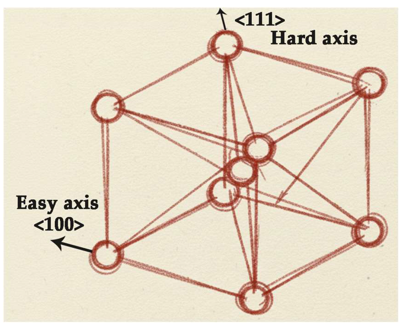 - Magnetocrystalline anisotropy establishes preferred magnetization directions (easy axes), with energies of ~50 kJ/m3 in iron.