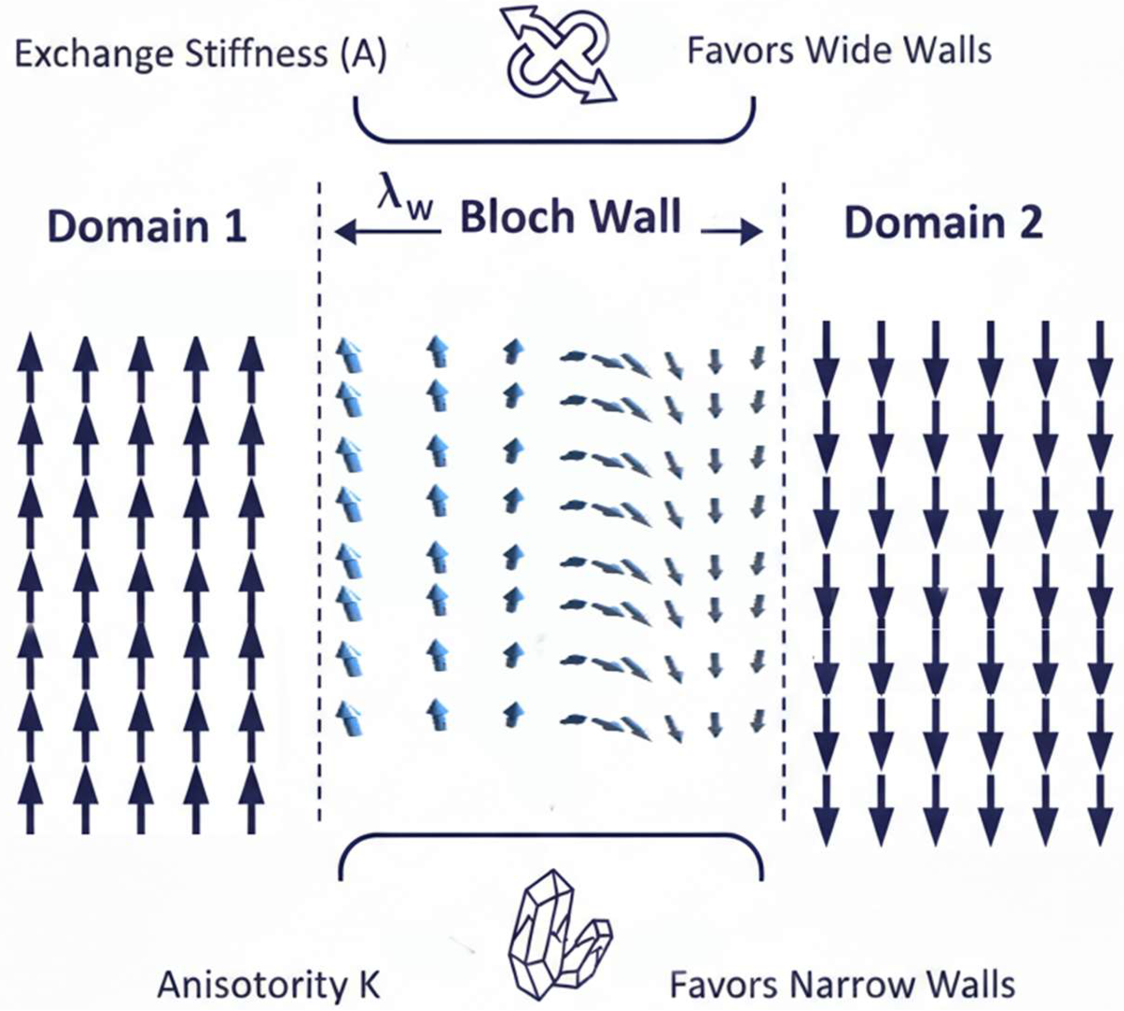 - Domain walls form as a compromise between exchange and anisotropy energies, with widths of 100–500 nm and energies of ~1 mJ/m2.