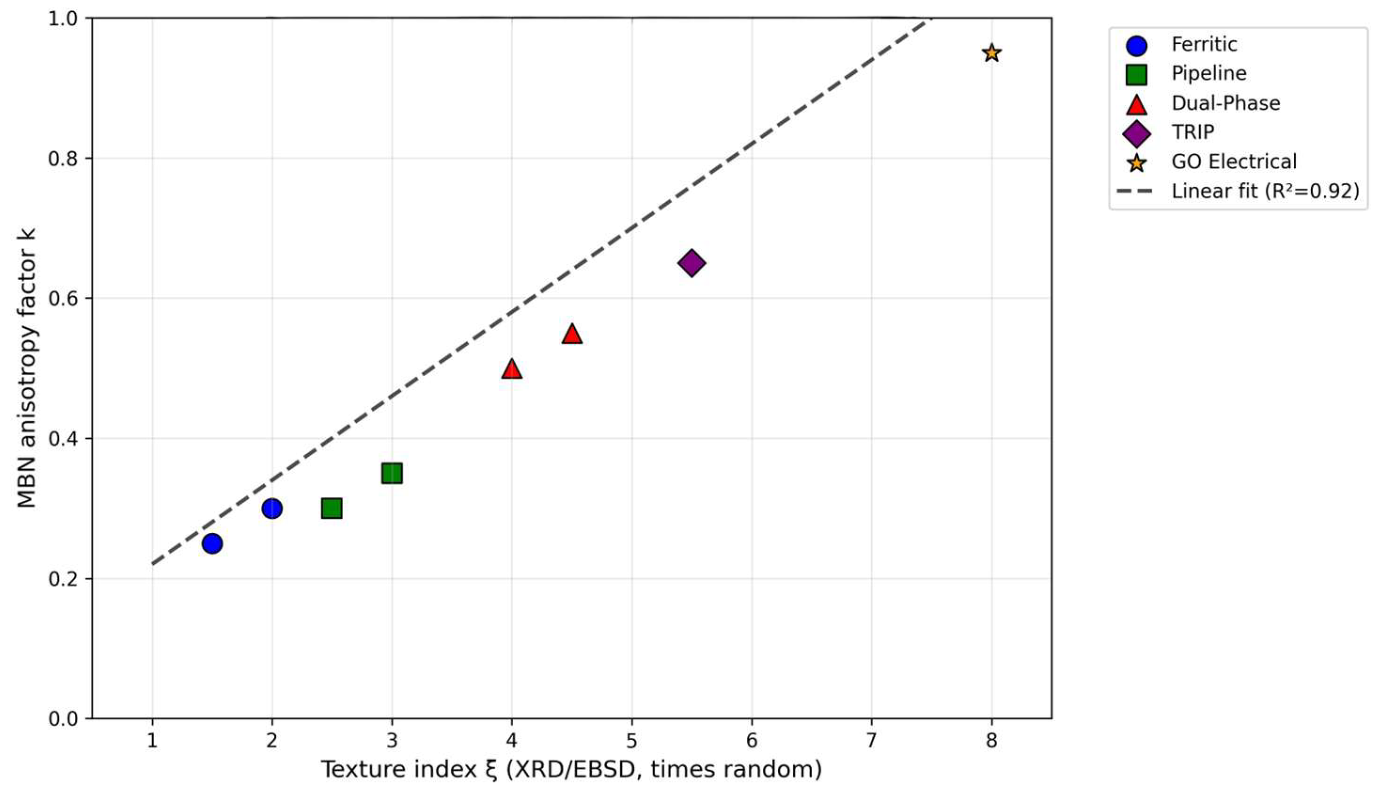 - Systematic compilation of quantitative MBN–texture correlations (R2 values, predictive models) across diverse steel grades.
