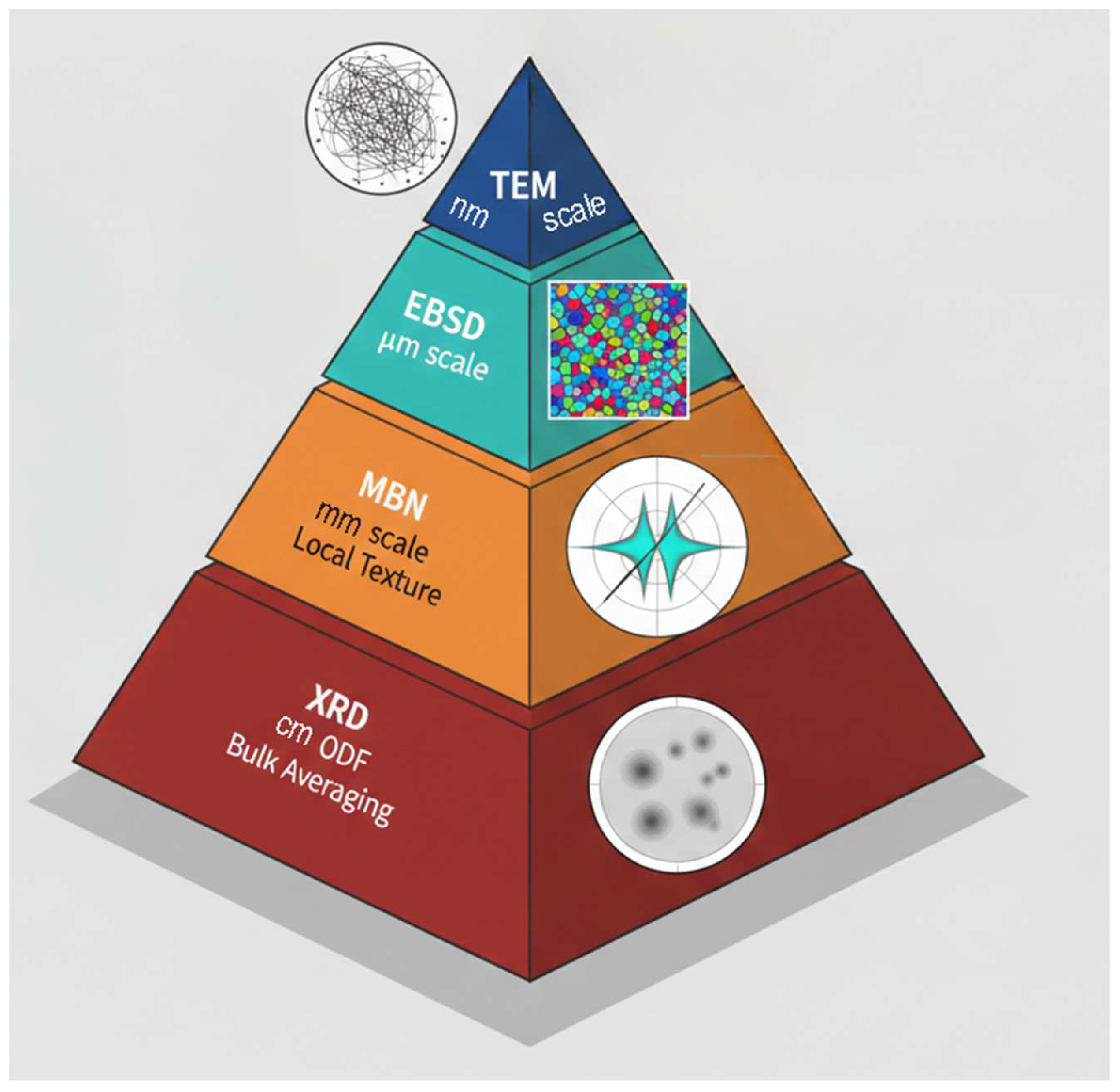 - Comprehensive review of complementary techniques (EBSD, XRD, MABN, 3MA) for multi-scale characterization.