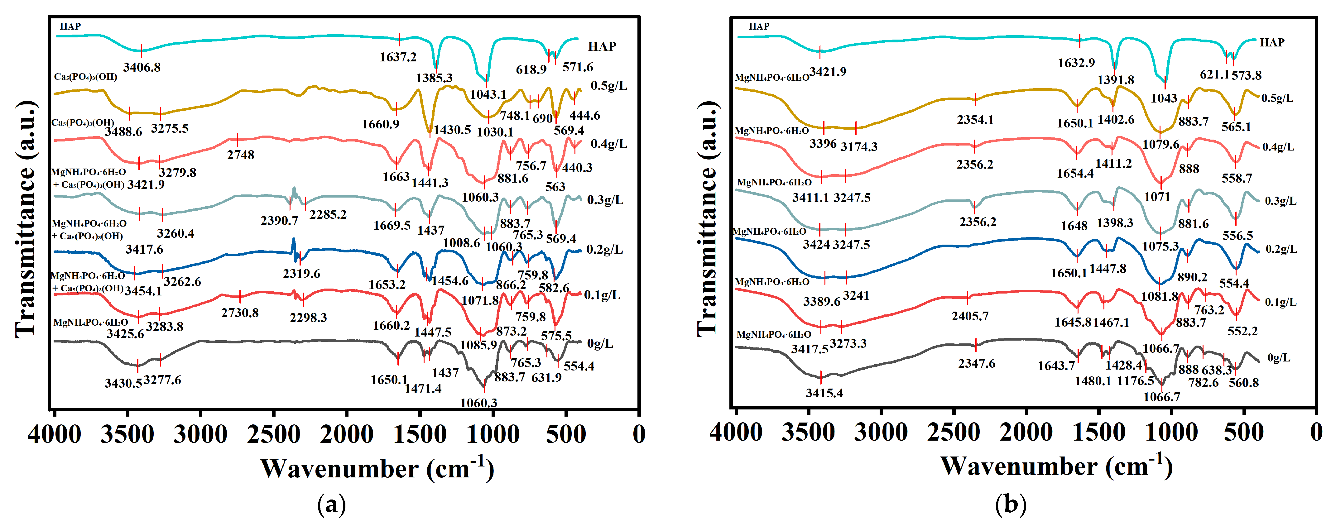 3.2.1. FTIR Spectra of Struvite Precipitates Under Ca2+ and Fe2+ Interference