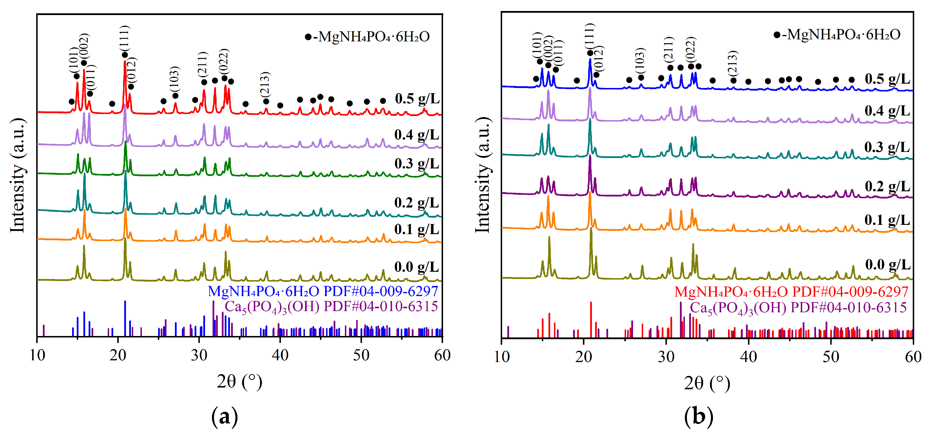 - Wang, Y.; Da, J.; Deng, Y.; Wang, R.; Liu, X.; Chang, J. Competitive adsorption of heavy metals between Ca-P and Mg-P products from wastewater during struvite crystallization. J. Environ. Manag. 2023, 335, 117552. [Google Scholar] [CrossRef]