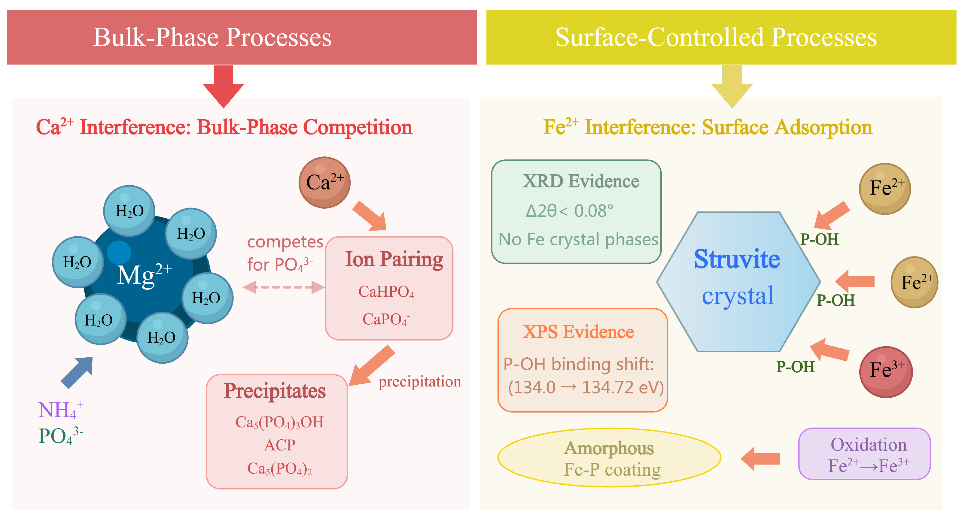 - Ca2+ and Fe2+ were found to suppress struvite crystallization through qualitatively different pathways. Ca2+ interference was dominated by bulk-phase chemical competition for phosphate and the promotion of Ca-P precipitation routes, which reduces the effective supersaturation available for struvite. In contrast, Fe2+ interference was better explained by surface-mediated processes under reducing conditions, where interfacial coordination/adsorption can impede nucleation and growth even without forming detectable crystalline Fe–P impurities. This distinction indicated that the inhibition is not a single phenomenon but a mechanism-dependent outcome.