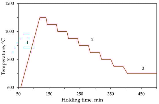 The glasses were then ground, placed in quartz crucibles, and heated to 1100 °C. Subsequently, they were cooled using a controlled stepwise regime, holding for 30 min at every 50 °C interval (as shown in Figure 1). Finally, the samples were held at 700 °C for 24 h to ensure system stabilization.