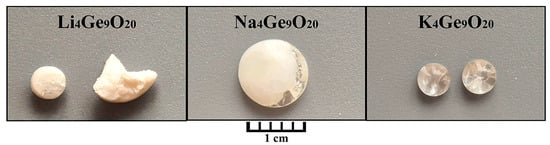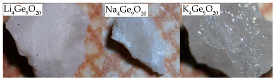 Figure 2 presents images of the original glasses. The Li4Ge9O20 composition demonstrates effective crystallization in air, while Na4Ge9O20 glass shows only partial crystallization under the same quenching conditions. In contrast, the potassium germanate glass remains amorphous after this quenching process.