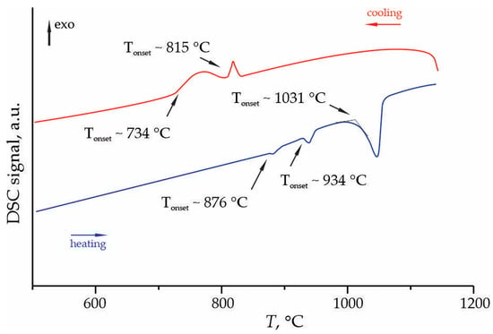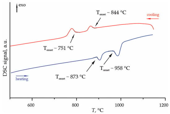Differential scanning calorimetry (DSC) measurements were performed using the STA 449 F5 Jupiter instrument (Netzsch, Selb, Germany). The experiments were carried out in PtRh20 crucibles with a volume of 85 μL. All DSC curves were recorded in the heating-cooling cycle from 50–1150 °C at a constant heating rate of 20 °C/min under a continuous argon gas flow.