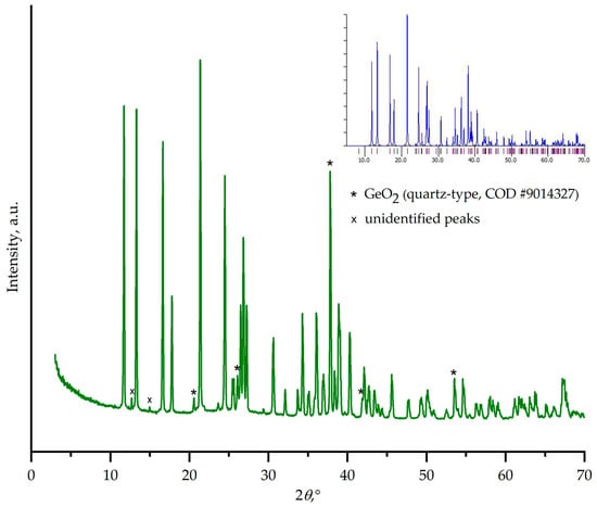 PXRD analysis revealed that the crystallization process yielded a mixture of three phases: lithium heptagermanate (Li2Ge7O15) as dominant compound, lithium enneagermanate (Li4Ge9O20), and a minor quartz-type GeO2 phase (Figure 4). The coexistence of several phases is typical for the Li2O-GeO2 system, as reported in previous studies [13,21].
