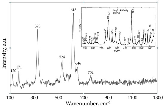 The Raman spectrum (Figure 8) of the phases crystallized from the 2Na2CO3-9GeO2 melt shows characteristic bands at 120, 171, 323, 524, 615, 646, 752, and 819 cm−1. This profile fits well with the Raman spectrum of Na4Ge9O20 crystallized from the Na2O·4.5GeO2 glass at 890 °C, as reported by Furukawa and White [18]. The bands at 615 and 646 cm−1 are evidently associated with the presence of vibrations from six-coordinated germanium atoms [24], while the vibration in the 323 cm−1 region indicates long-range order in crystalline sodium germanate. The band at 524 cm−1 is likely related to vibrations of mixed ring units containing [GeO4] tetrahedra and [GeO6] octahedra [27]. The low-intensity band at 752 cm−1 arises from Ge-O bond vibrations in germanate tetrahedra. The low-frequency bands at 120 and 171 cm−1 present in the spectrum of crystalline Na4Ge9O20 represent vibrations of various types of oxygen bonds with sodium cations.