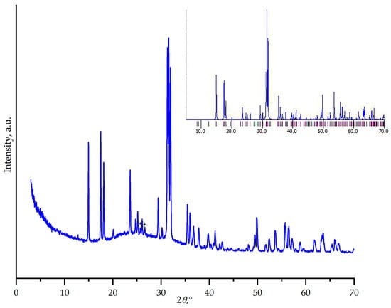 The phase composition of the phases crystallized from the 2Na2CO3–9GeO2 melt was unambiguously determined using a combination of powder X-ray diffraction and Raman spectroscopy techniques. The PXRD pattern (Figure 7) confirmed that the crystallization process primarily yielded the target phase, sodium enneagermanate Na4Ge9O20. All major reflections correspond well with the reference pattern (PDF #00-018-02368), establishing it as the dominant crystalline component [14,30].