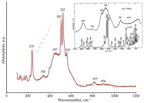 The phase identification was further corroborated by Raman spectroscopy. The spectrum of the crystallization products (Figure 12) shows characteristic bands at 235, 340, 447, 505, 522, 555, 819, and 896 cm−1. These spectral features are consistent with literature data for the K2Ge4O9 phase [18] and agree well with the PXRD results, confirming the local structure of the synthesized compound. The crystal structure exhibits Ge atoms in both four- and six-fold coordination in a 1:3 ratio. The set of bands in the low-frequency region of 100–300 cm−1, with the most intense at 235 cm−1, corresponds to potassium-oxygen bond vibrations, which may be partially deformational or stretching in nature [27]. The strong doublet observed at 505–522 cm−1 is assigned to [IV]Ge-O-[VI]Ge bridges connecting tetrahedral and octahedral germanium units. Similarly, the band at 555 cm−1 is attributed to the symmetric stretching vibration of [IV]Ge-O-[IV]Ge bridges in three-membered rings of [GeO4] tetrahedra, as well as of mixed [IV]Ge-O-[VI]Ge bridges. [24,26,35]. The bands around 819 and 896 cm−1 can also be attributed to the TO/LO splitting of antisymmetric stretching vibrations of Ge-O-Ge bonds [26,27,28,29].