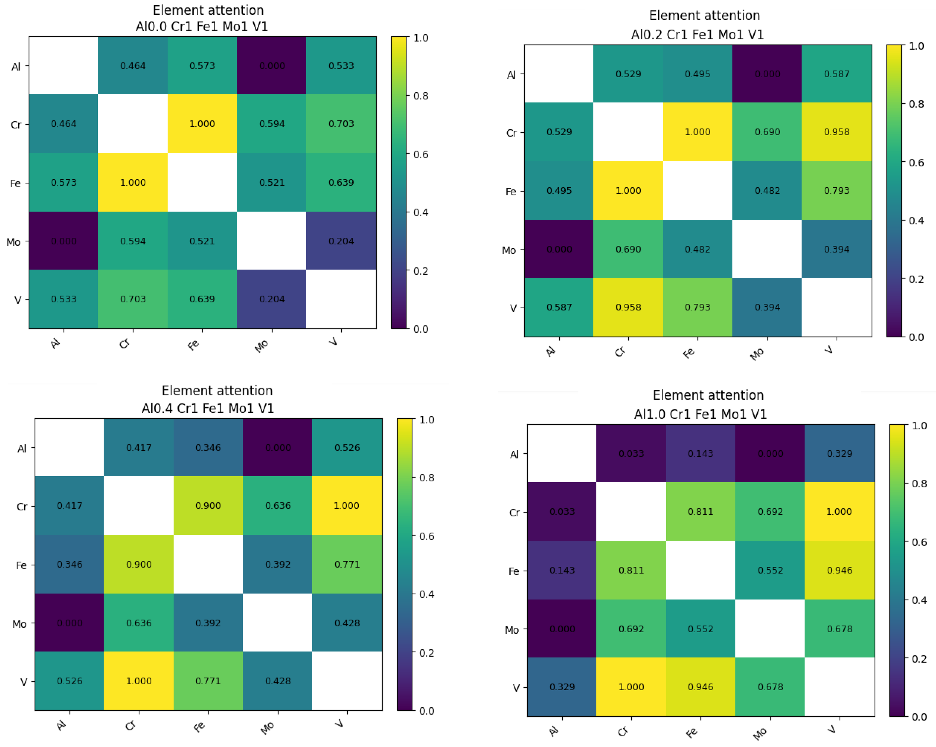 Figure 2) show a progressive transition from a broadly distributed interaction landscape at low Al to a strongly partitioned interaction architecture at high Al (and this evolution is consistent with the experimentally reported microstructural development as Al is increased). At Al = 0, the attention matrix is comparatively less polarized and the interaction weights are more evenly distributed across element pairs, indicating that the model represents the alloy through a relatively homogeneous transition-metal interaction network. As Al increases (0.2 → 0.4 → 0.6 → 1.0), the maps evolve toward increasingly concentrated coupling among Cr-V-Mo, accompanied by a relative suppression of cross-links from this subset to the remaining elements. In interpretability terms, the model is increasingly encoding a clustered V-Cr-Mo interaction backbone, rather than a single uniformly mixed network.