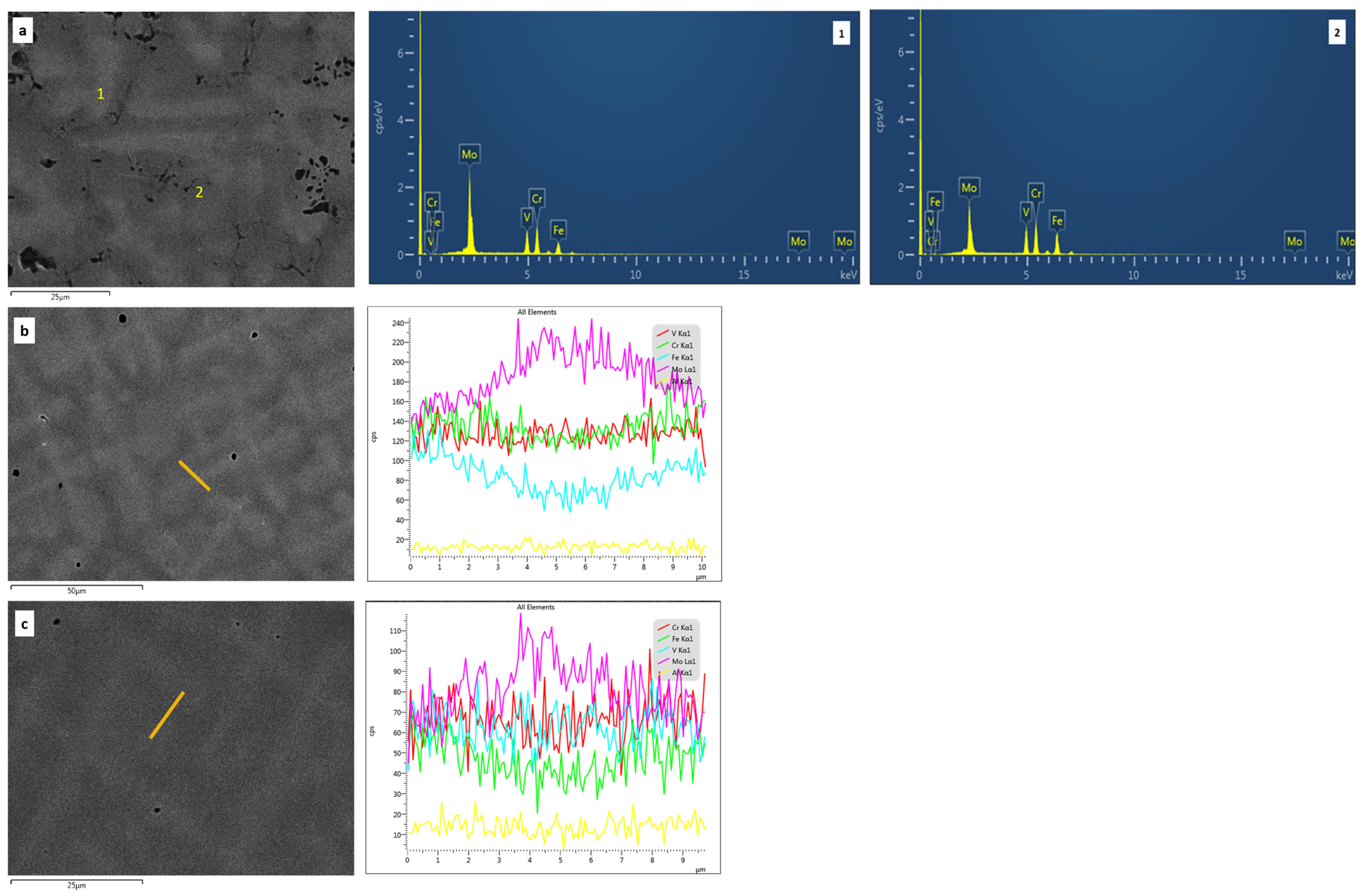 Figure 4a,b) exhibits a clear dendritic morphology with noticeable segregation. It presents the coarsest dendritic structure, controlled by Mo-rich cores nucleating early. The addition of 2 at.% Al (