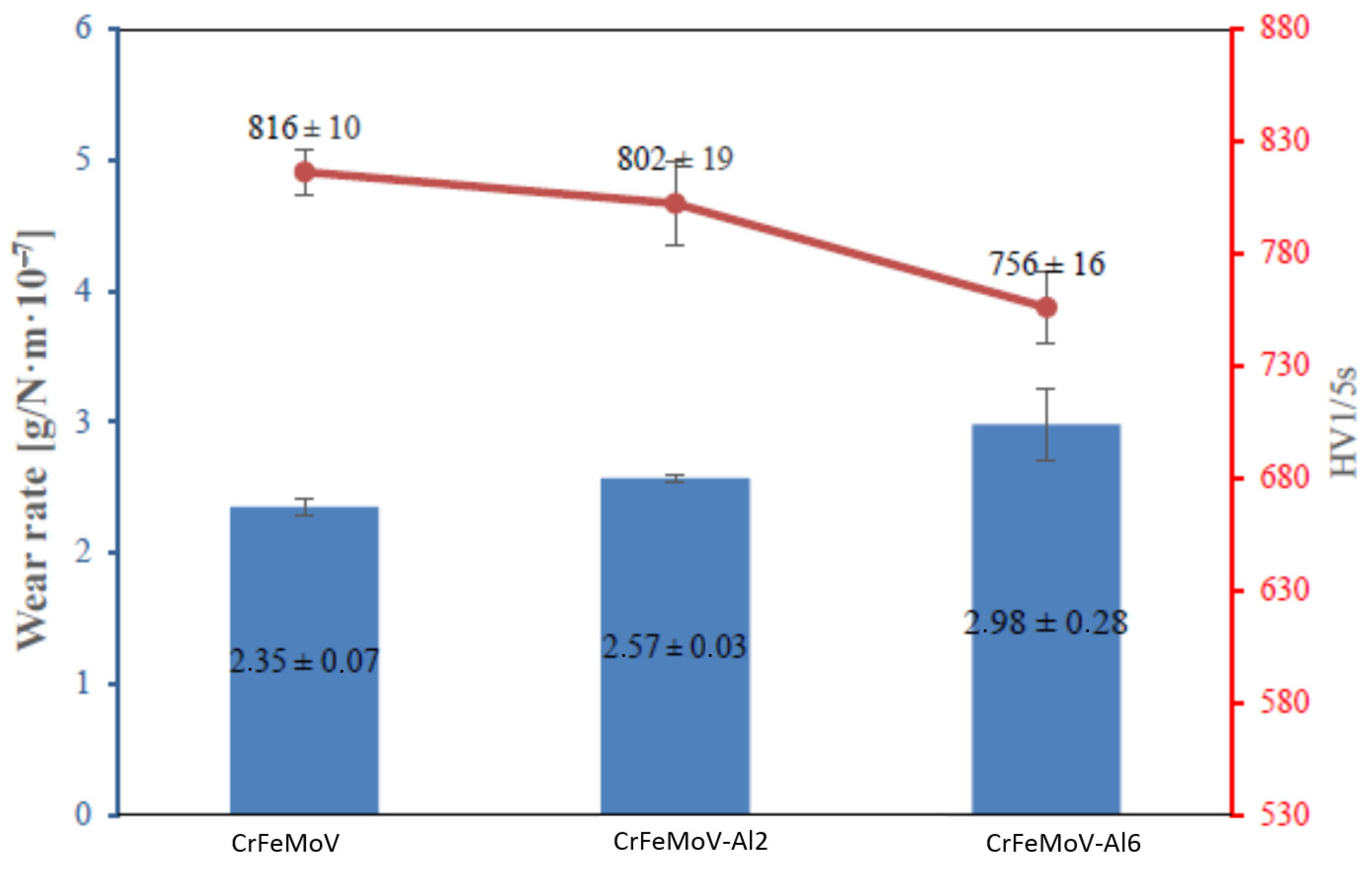 Figure 6 where hardness is often directly proportional to wear resistance for abrasive or adhesive wear mechanisms. The addition of Al from 0 at.% to 6 at.% in the CrFeMoV system has a detrimental effect on the wear resistance improvement.