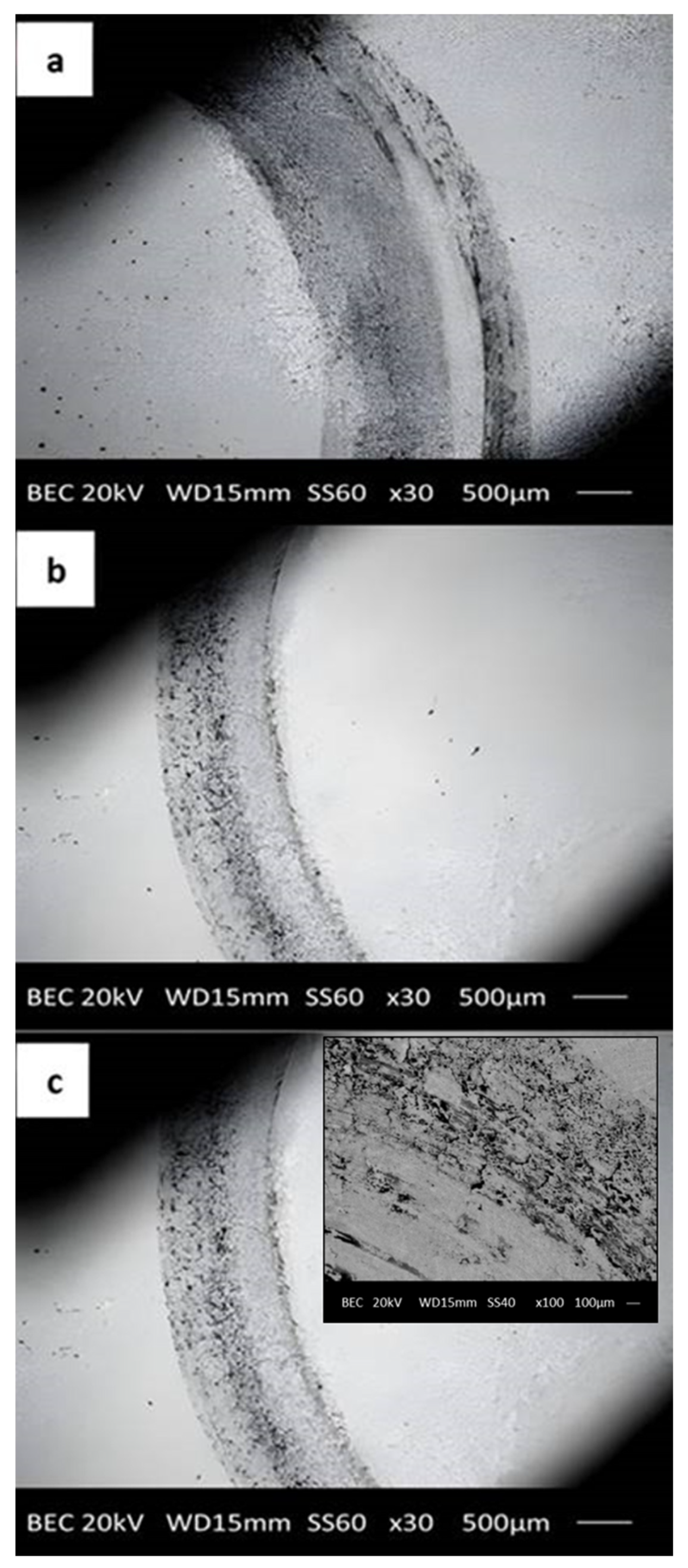 Figure 8c), the tribological behavior becomes more complex. The enlarged presence of Al oxides, the refined microstructure, and the reduced intrinsic hardness promote adhesive interactions between the alloy surface and the counterface material. The synergy of these effects produces a mixed wear regime in which delamination, third-body abrasion, and adhesion all coexist. The scale of material removal becomes governed not merely by mechanical hardness, but by the electronic and chemical instabilities introduced by high Al concentrations, which modify surface bonding and accelerate oxide-assisted wear.