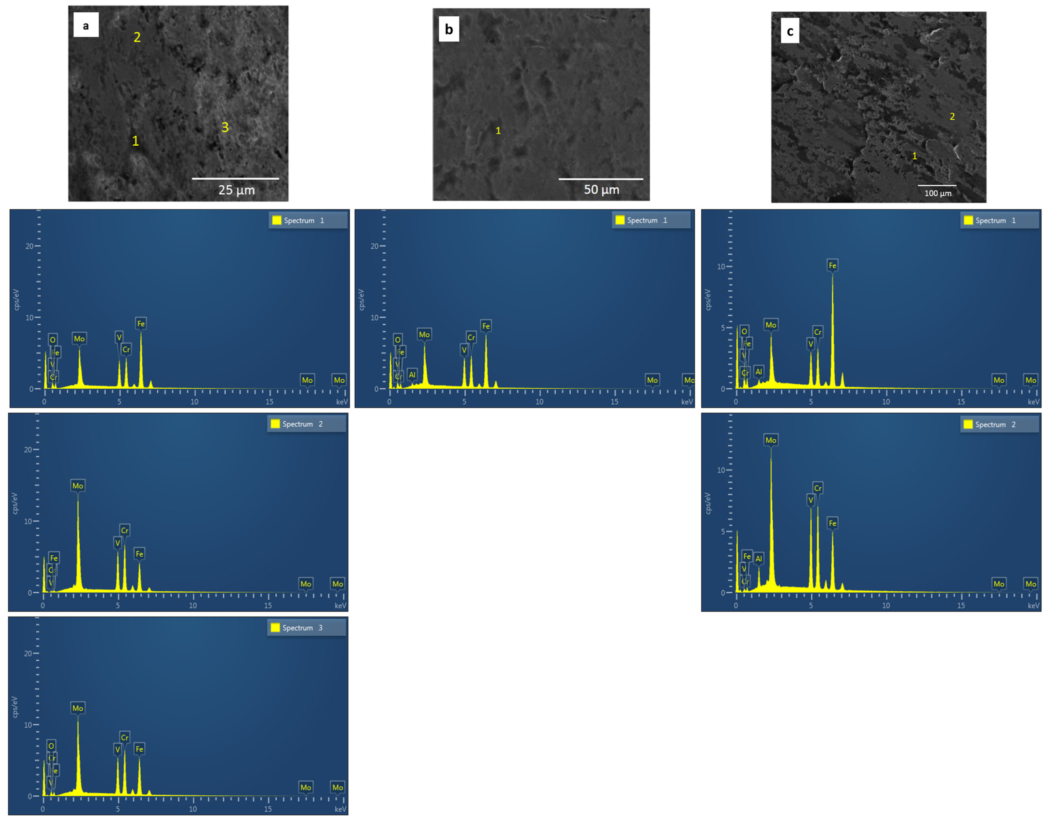 Regarding the evaluation of the wear tracks morphology and corresponding EDX analysis, in the CrFeMoV alloy (