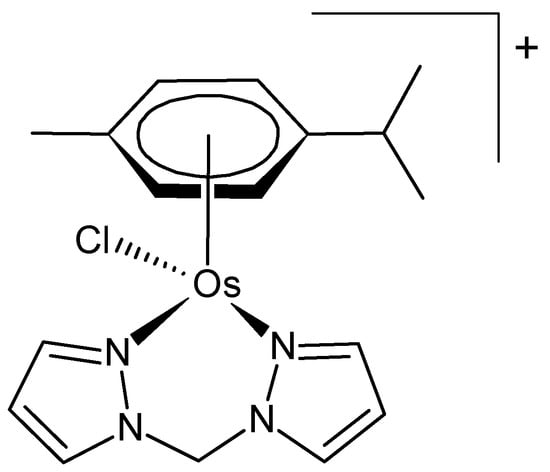 - Infante-Tadeo, S.; Rodríguez-Fanjul, V.; Vequi-Suplicy, C.C.; Pizarro, A.M. Fast hydrolysis and strongly basic water adducts lead to potent Os(II) half-sandwich anticancer complexes. Inorg. Chem. 2022, 61, 18970–18978. [Google Scholar] [CrossRef]