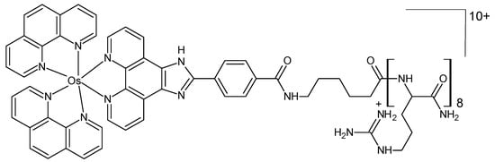 The complex osmium(II) (bis-2,2-bipyridyl)-2(4-carboxylphenyl)imidazo [4,5f][1,10] phenanthroline (Figure 8) was synthesized and linked to octaarginine, a cell-penetrating peptide [73]. A comparison was made between the properties and bioactivity of the osmium complex and those of its ruthenium analog. Neither the parent osmium complex nor its peptide conjugate was oxygen responsive. Their cytotoxicity in the Chinese hamster ovarian CHO and murine myeloma spleen SP2 cell lines was low in both complexes, in the dark as well as under irradiation with a continuous white light source.