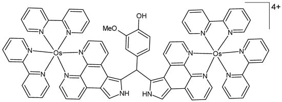 A new dinuclear osmium(II) polypyridyl-type complex bridged by (4-hydroxy-3-methoxyphenyl)diphenanthropyrromethane was prepared as a potential phototherapeutic agent, and its binding to calf thymus DNA was investigated (Figure 9) [74]. The structure of the complex was characterized by UV/Vis spectroscopy, cyclic voltammetry, and elemental analysis. Photocleavage studies with circular plasmid DNA were performed under low-energy light irradiation, resulting in complete photocleavage of the DNA. Investigations on the mechanism of DNA photocleavage suggest that the activity arises from the formation of both 1O2 and oxygen radicals. The osmium(II) complex demonstrated significantly greater efficacy in photocleavage compared to its ruthenium analog.