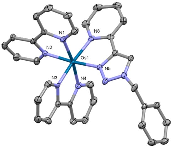 Osmium(II) pyridyltriazole complexes [Os(bpy)3−n(pytz)n][PF6]2 (bpy = 2,2′-bipyridyl, pytz = 1-benzyl-4-(pyrid-2-yl)-1,2,3-triazole, n = 0–3) were also prepared by Omar et al. [82]. Crystal structure was obtained for the compound [Os(bpy)2(pytz)]2+ (Figure 11). The complex crystallizes in the space group P21/n, adopting a distorted octahedral geometry. The complexes were investigated for their potential as phosphorescent cellular imaging agents. Cytotoxicity in the dark as well as long-term viability were evaluated in the bladder cancer (EJ) cell line and the HeLa cervical cancer cell line, indicating that the complexes have comparatively low dark toxicity levels in both cell lines. Preliminary experiments to assess photocytotoxicity were conducted upon 455 nm irradiation, demonstrating no photoactivated cytotoxicity.