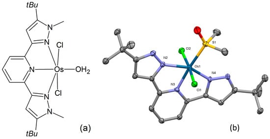 Preparation and structural characterization of three novel osmium(II) complexes were reported by Petrović and co-workers [87]. Their chemical composition corresponds to the general formula [OsIILCl2(H2O)], where L = 2,6-bis(5-tert-butyl-1H-pyrazol-3-yl)pyridine, 2,6-bis(5-tert-butyl-1-methyl-1H-pyrazol-3-yl)pyridine, and 2,2′:6′,2″-terpyridine, respectively. The chemical structure of one of the complexes (Figure 13a) was examined through single-crystal X-ray analysis (Figure 13b). This distorted octahedral complex features a nearly planar tridentate N,N,N-donor ligand in a mer arrangement. Crystallization from a DMSO/water mixture resulted in the replacement of the coordinated water molecule with DMSO. The osmium atom is located above the bis(pyrazolylpyridine)-ligand plane, while the sulfur donor atom of the coordinating DMSO resides within the ligand plane. The chlorides exhibit an axial orientation. The binding affinities of the complexes under examination to biologically significant molecules, CT-DNA, and HSA were investigated by means of UV-Vis spectrophotometry, fluorescence spectroscopy, and gel electrophoresis, showing moderate interaction. Substitution reactions with GSH, L-Met, and 5′-GMP were also examined. The evaluation of the complexes’ cytotoxicity in the HCT-116, SW-480, MRC-5, and HeLa cell lines demonstrated marked activity in several instances.