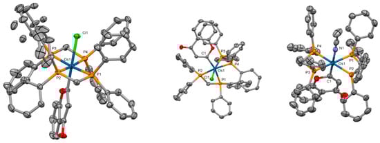 X-ray single-crystal structures of the osmium complexes studied in [91] (CCDC 1979800–1979802); partial numbering scheme; hydrogen atoms, counterions, and solvent molecules are omitted for clarity; ellipsoids drawn at 50% probability level. Color code: Os dark green, Cl light green, N blue, P orange, O red, C grey. Depiction of the structures with Mercury® software.