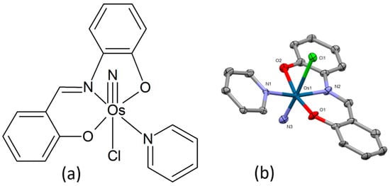 Huang et al. described the preparation of three nitrido-osmium(VI) complexes with the composition [OsVI(N)(sap)(py)Cl], [OsVI(N)(sap)(pz)Cl], and [OsVI(N)(sap)(MeIm)Cl] (sap = N-salicylidene-2-aminophenol, py = pyridine, pz = pyrazole, MeIm = 1-methylimidazole) [98]. Due to its favorable solubility and stability in water solution, [Os(N)(sap)(py)Cl] (Figure 17a) was selected as a potential anti-cancer candidate compound for a more thorough examination. Its molecular structure was examined using X-ray crystallography. The central atom displays a distorted octahedral geometry with the osmium atom linked to one tridentate sap ligand, one N3−, one Cl−, and one py ligand (Figure 17b). An evaluation of the in vitro antiproliferative activities was conducted using a panel of cancer cell lines, including cisplatin-resistant cells (IC50 values of 2.8–13.8 μM). The complex was also found to interfere with the induction of G2/M phase arrest, reduction in mitochondrial membrane potential, and induction of caspase-mediated apoptosis through the activation of mitochondrial (intrinsic) and death receptor (extrinsic) pathways in HepG2 cells. The antitumor efficacy in vivo of the osmium(VI) complex was studied in HepG2-bearing nude mice. Compared to cisplatin, the complex displayed good anti-cancer activity with a low propensity to toxic side effects.