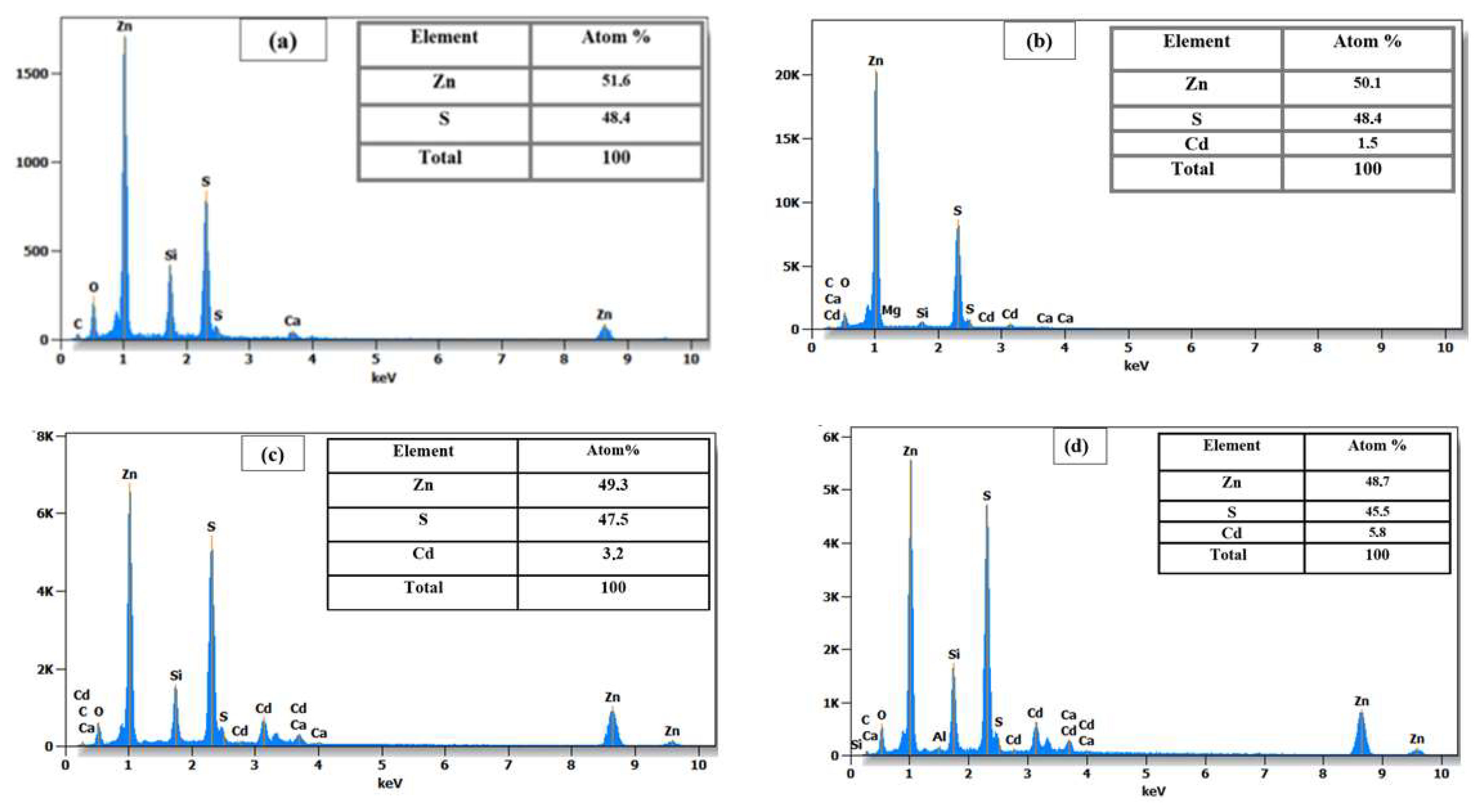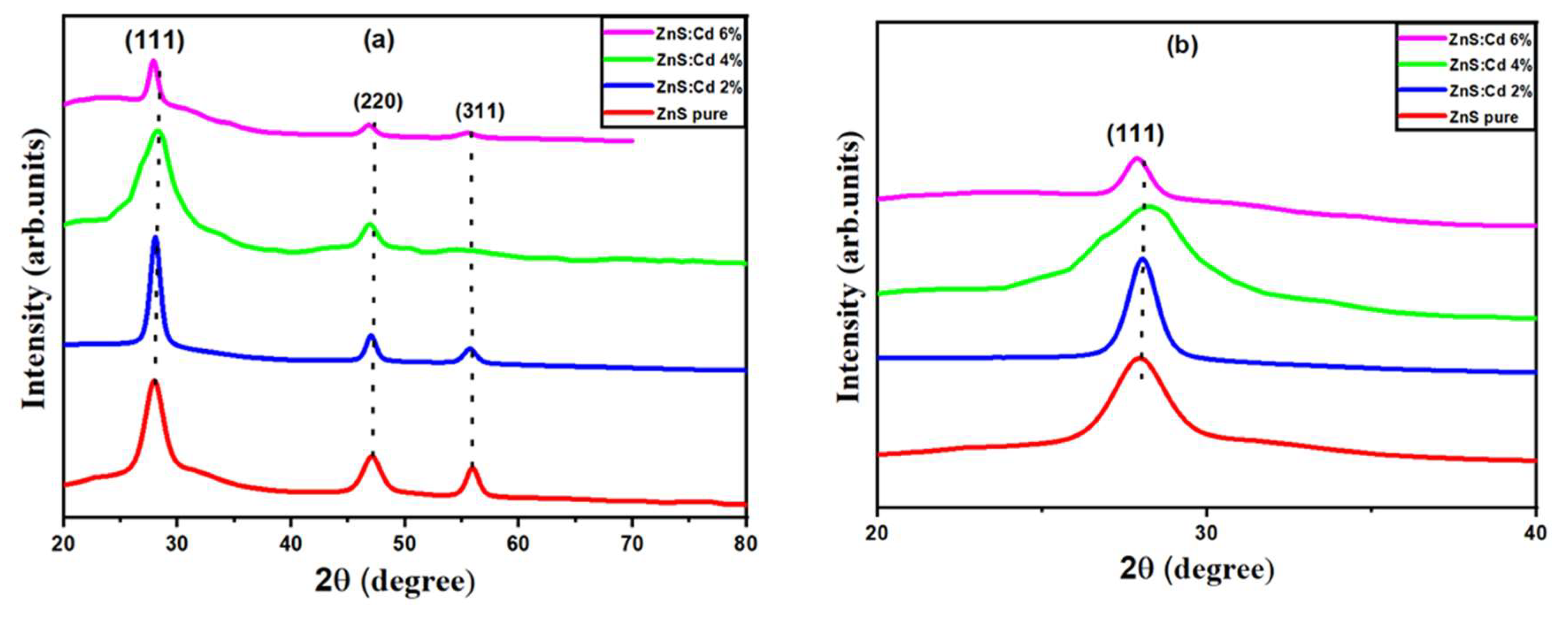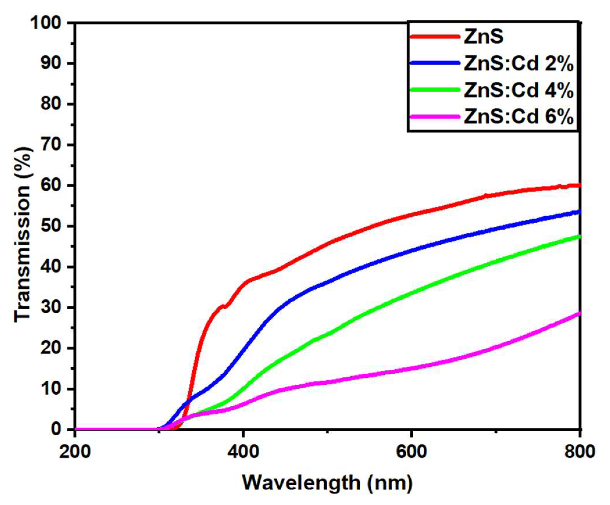 - Mosavi, S.M.; Kafashan, H. Physical Properties of Cd-Doped ZnS Thin Films. Superlattices Microstruct. 2019, 126, 139–149. [Google Scholar] [CrossRef]