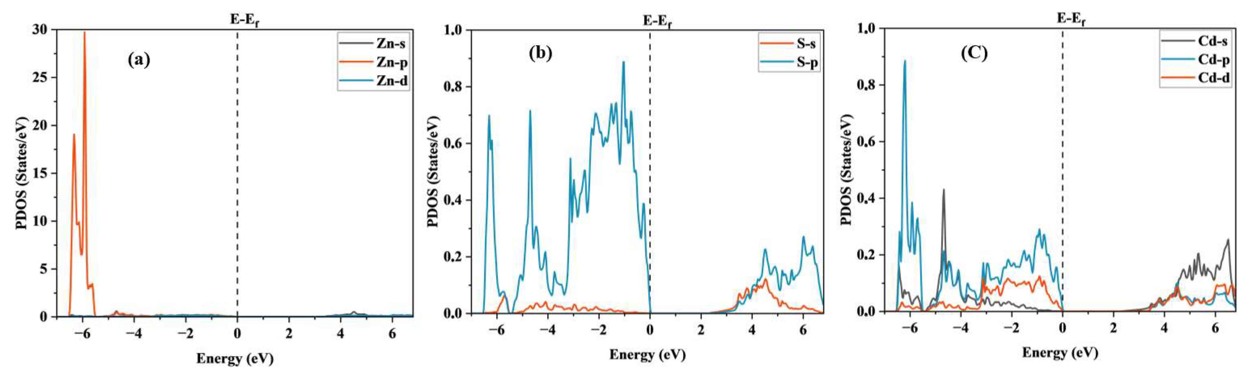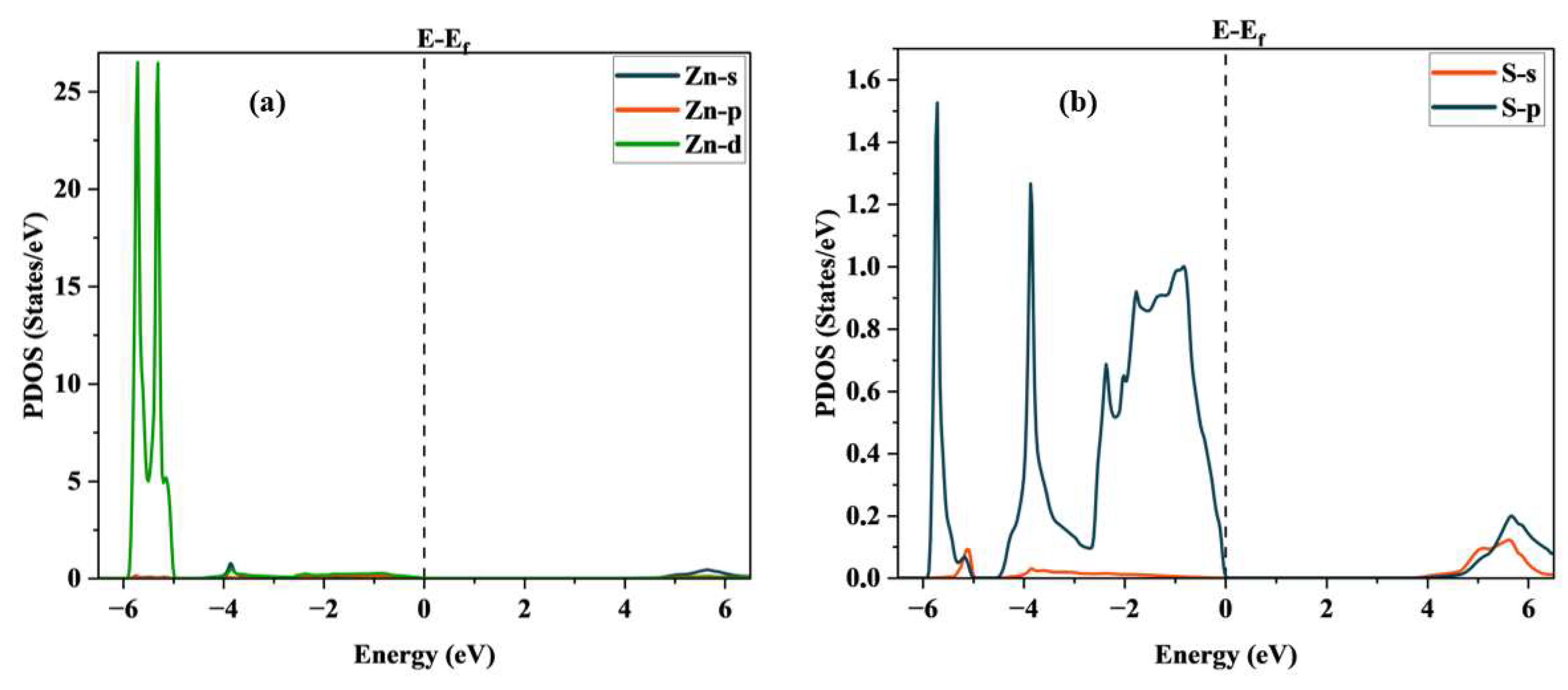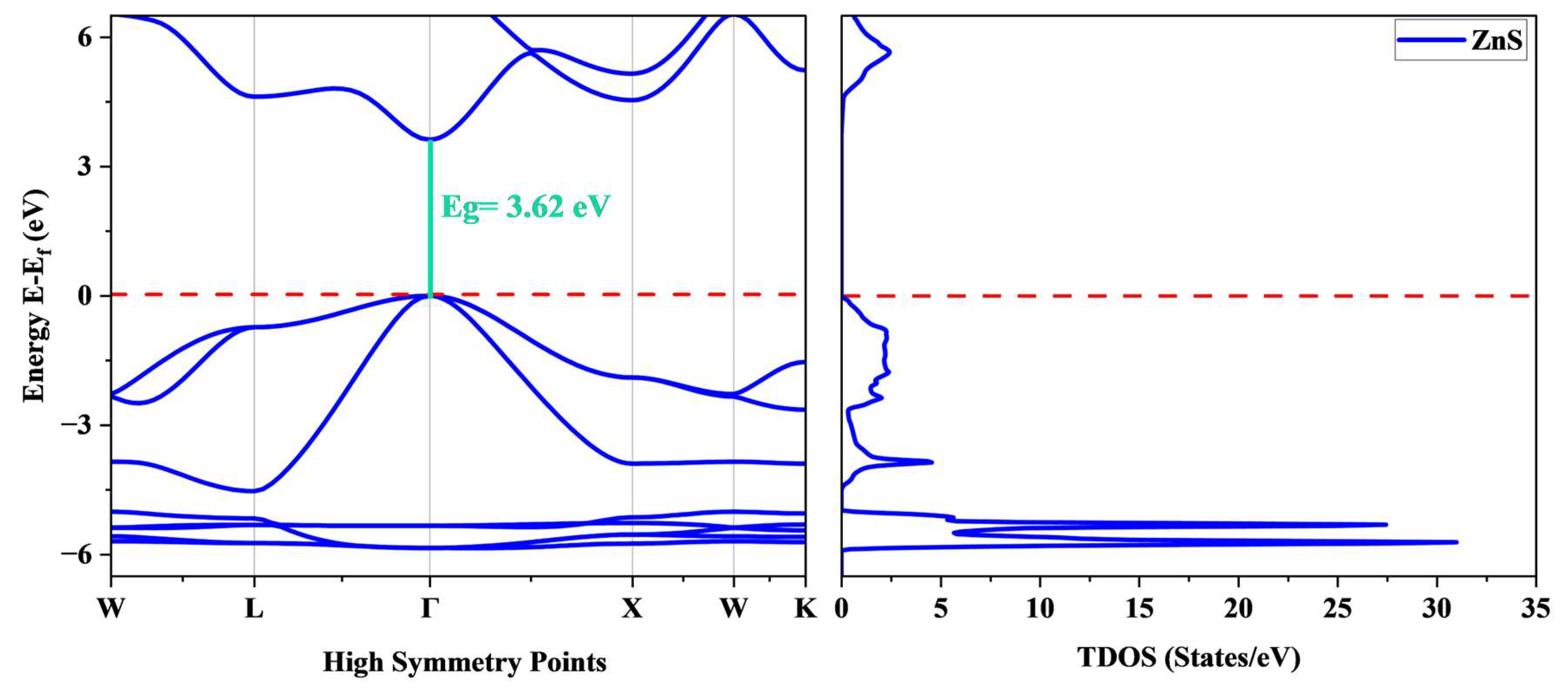 3.6.2. Electronic Structure of Pure and Cd-Doped ZnS (6%)