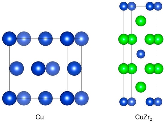 Figure 1 shows the unit cell structures of face-centered cubic Cu and body-centered tetragonal CuZr2 crystals. We first performed structural relaxation on the Cu and CuZr2 unit cells, including volume and atomic coordinates, and conducted bulk property tests. By fitting the Birch–Murnaghan equation of state, we obtained the lattice constants and bulk modulus for Cu and CuZr2, as summarized in Table 1. The results show reasonable agreement with reference data from the Inorganic Crystal Structure Database (ICSD) [20], experimental values [21,22,23], and other theoretical results [24]. This consistency validates the appropriateness of our computational parameter settings.