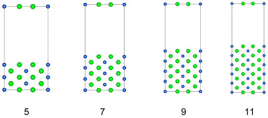 Thus, according to Equation (4), the total energy of the surface supercell exhibits a linear relationship only with the number of Zr atoms (or equivalently, the total number of layers in the surface supercell). However, surface energy calculations using surface supercells with different numbers of atomic layers yield varying results. To avoid such discrepancies, we have constructed four (010) surface supercells with 5, 7, 9, and 11 atomic layers, as shown in Figure 2: