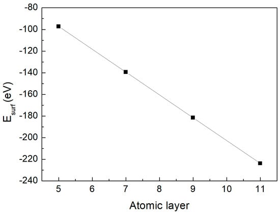Based on the relationship between the total energy of different supercells and the number of atomic layers, their linear correlation was fitted, as presented in Figure 3. According to Equation (5), the intercept b of this fitted line was extracted, yielding a surface energy of 1.82 J/m2 for the Cu-Zr stoichiometric surface.
