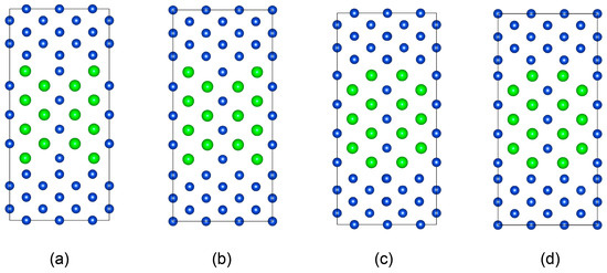 First, considering the difference in elastic moduli between Cu and CuZr2, a compressive strain of approximately 2.8% and a tensile strain of 6% are applied to the CuZr2 crystal along the <001> and <300> basis vector directions, respectively, to achieve coherence with the Cu matrix. Second, taking full account of the centrosymmetry of the interface supercell and the types of terminal atomic structures at the interface, a sandwich structure model of Cu/CuZr2/Cu is employed to construct four different structural interface supercells, as shown in Figure 5. Here, the top and bottom five atomic layers represent the Cu matrix, while the middle seven atomic layers represent the CuZr2 precipitate phase. Relaxation calculations are performed on the constructed interface supercells, with the lowest-energy structure selected as the Cu (110)/CuZr2 (010) interface structure (as shown in Figure 5c).