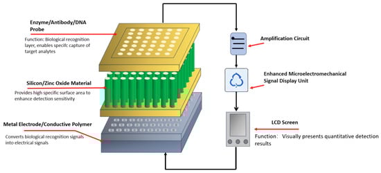 The working principle of biosensors integrates three interdependent components, ensuring coherent transduction from target analyte recognition to final data presentation. The schematic diagram of the nanowire biosensor structure is shown in Figure 2. The nanowire biosensor is mainly composed of a three-dimensional nanowire array, a biorecognition layer, a transduction layer, a signal processor and a display unit. Firstly, the biorecognition element—comprising enzymes, antibodies, or specific DNA sequences—undergoes specific binding with the target analyte. This molecular interaction constitutes the core detection event [42]. Subsequently, the transducer converts this biorecognition event into an electrical signal. This conversion process not only confirms the presence of the target molecule but also quantifies its concentration through signal intensity variations. However, as the electrical signals generated by transducers are often weak, signal processing and display units are required to amplify and digitize these signals [56,57,58].