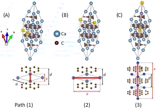Within the RH formalism, superconductivity is described in terms of symmetry-allowed real-space paths connecting equivalent atoms of the superconducting sublattice. As discussed previously in Ref. [23], in the case of , only Ca–Ca connections are assumed to carry the superconducting wave, whereas carbon atoms act exclusively as near or blocking atoms that influence the superconducting paths through phonon-mediated interactions.