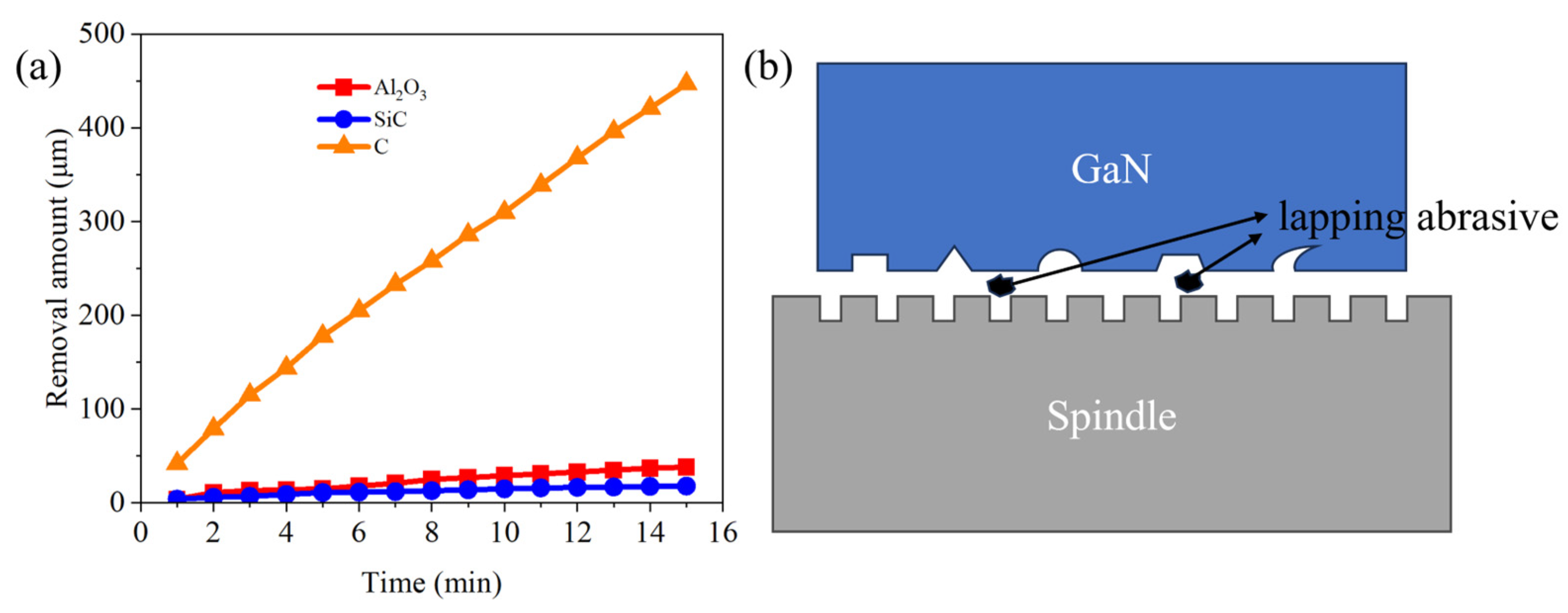 - Xu, M.; Gao, T.; Li, L.; Wang, B.; Chen, Q.; Huang, J.; Xiao, Q. Removal mechanism of double-diamond-abrasive-grinding GaN single crystals under graphene lubrication. Diam. Relat. Mater. 2024, 148, 111381. [Google Scholar] [CrossRef]