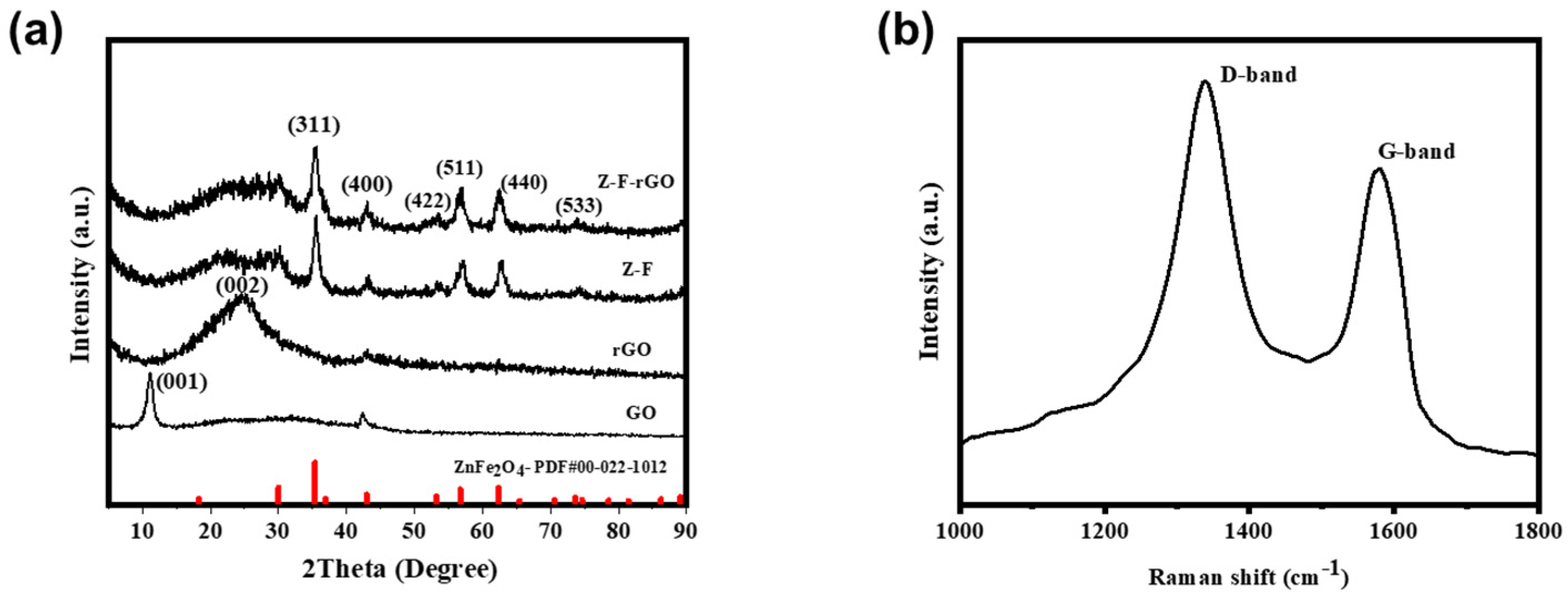 - Naseer, H.; Soomro, S.A.; Gul, I.H. Increased dielectric properties of ZnFe2O4/rGO nanohybrid via thermo-chemical route. J. Aust. Ceram. Soc. 2022, 58, 1265–1274. [Google Scholar] [CrossRef]