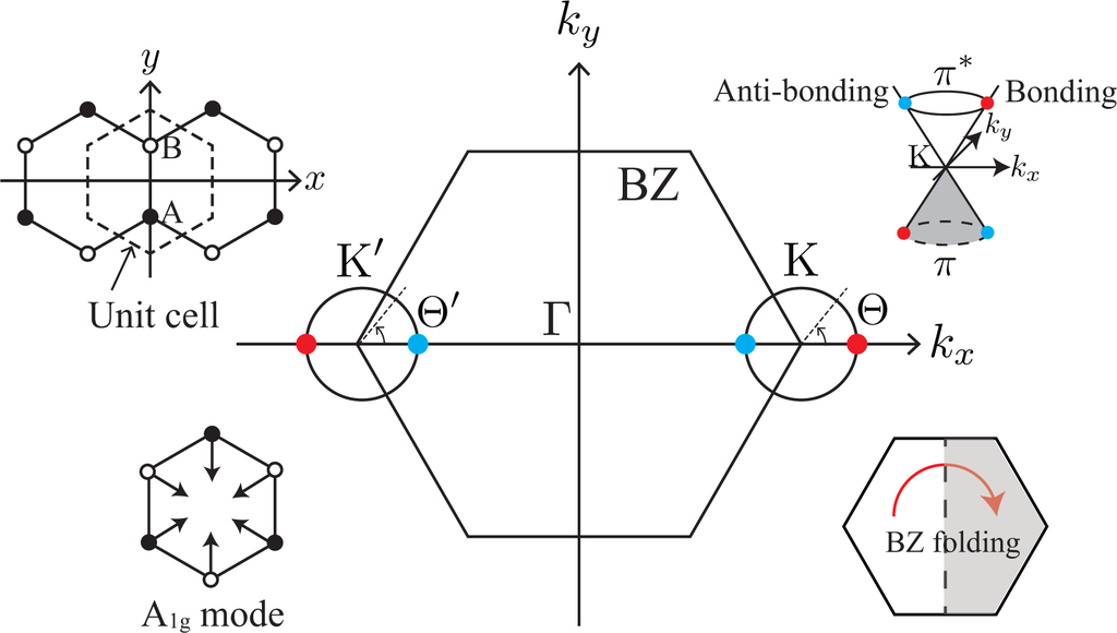 Graphene’s hexagonal unit cell has two carbon atoms, denoted by A and B in Figure 1, and the electron’s wave function ψ is written as a linear combination of 2pz atomic orbitals of the A and B atoms, χA and χB. When we apply Bloch’s theorem to graphene, we obtain ψ and the band structure as a function of the wave vector k [15,16]. In the Brillouin zone (BZ) of graphene, there are two points, namely the K and K′ points, where the conduction and valence bands touch each other. The orbitals of the states near the K point take the form of