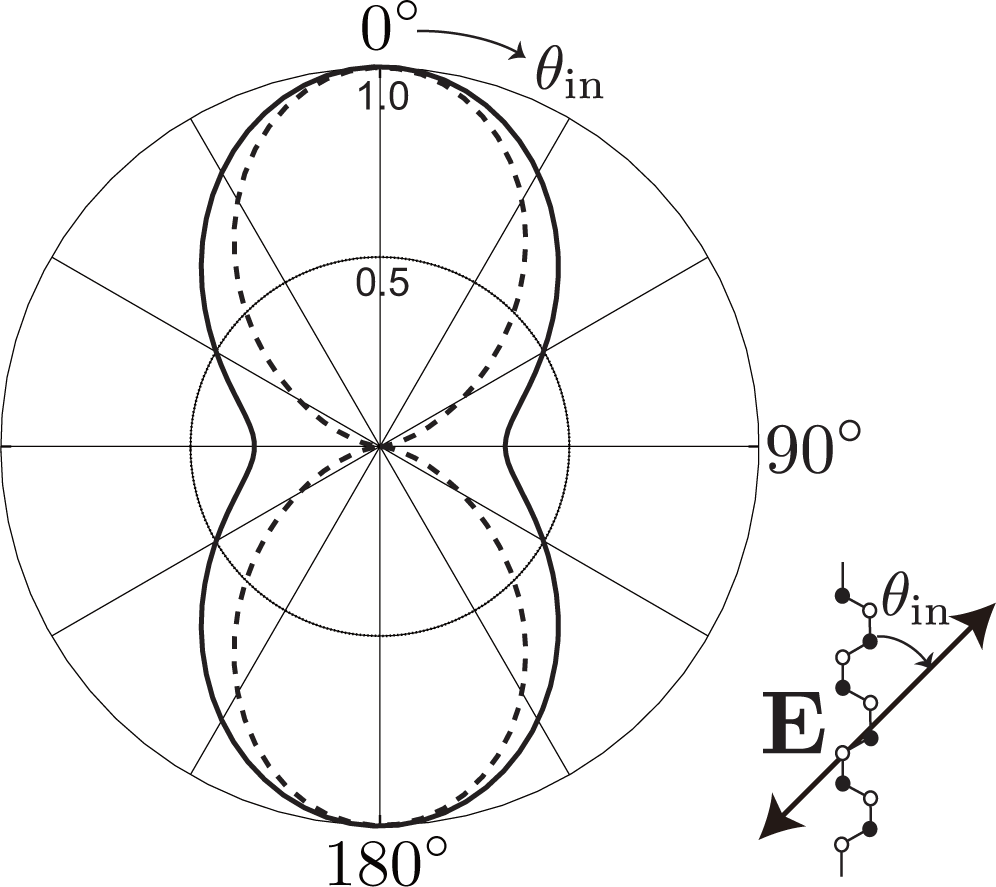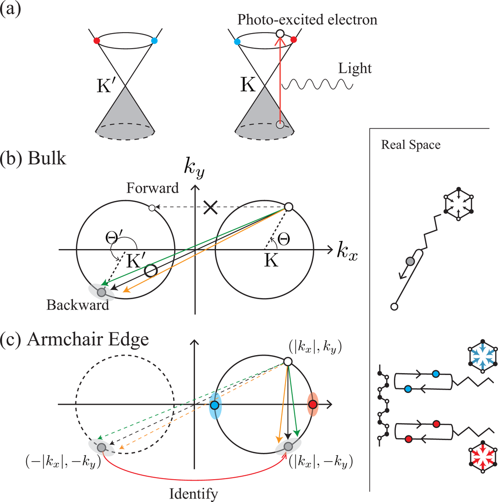 The third factor is the polarization dependence of optical transitions. To supply photo-excited electrons to the states with bonding and antibonding orbitals on the kx-axis, the polarization of incident laser light must be set parallel to the armchair edge (y-axis), as shown in Figure 4b. The photo-excited electrons on the kx-axis emit A1g modes without changing their positions [see Figure 4a]. Meanwhile, when the polarization of the incident laser light is set perpendicular to the armchair edge, the x-polarized light supplies the states on the ky-axis with photo-excited electrons [see Figure 4c]. The electrons near the ky-axis change their positions in the folded BZ when they emit A1g modes [see Figure 2b], and these electrons on the ky-axis do not contribute to the D band intensity. As a result, the D band can be strongly dependent on the laser light polarization: the D band intensity is enhanced (suppressed) when the polarization of the incident laser light is parallel (perpendicular) to the armchair edge.