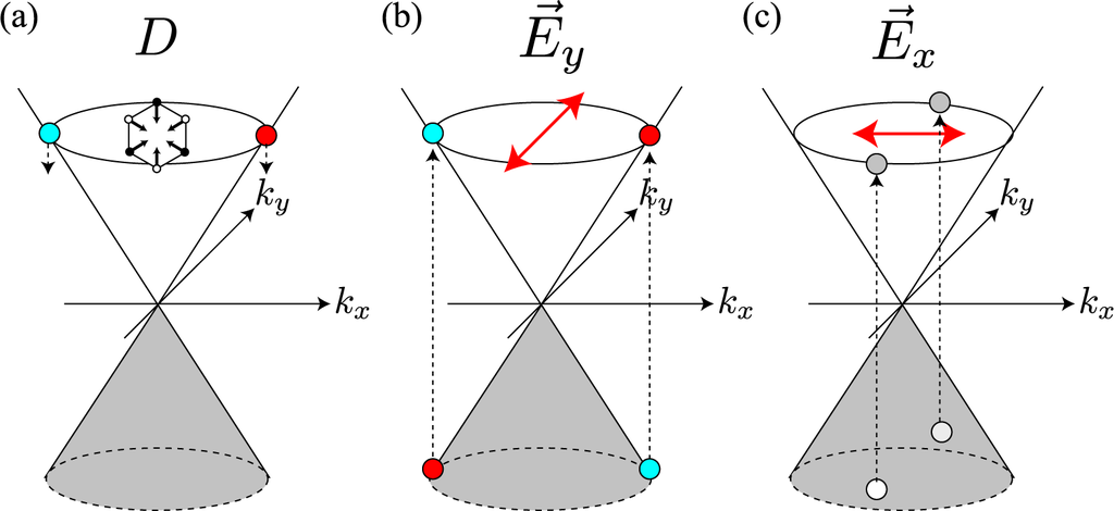 The massless Dirac equation in Equation (3) is decomposed into two Weyl’s equations for the K and K′ valleys: and respectively. To reproduce Equation (1), we assume the plane wave solution and obtain the energy eigenequation ħvFσ·kψK(k)= EψK(k). Then, the corresponding energy eigenvalue and eigenstate are easy to find using as E=sħvF|k| and
