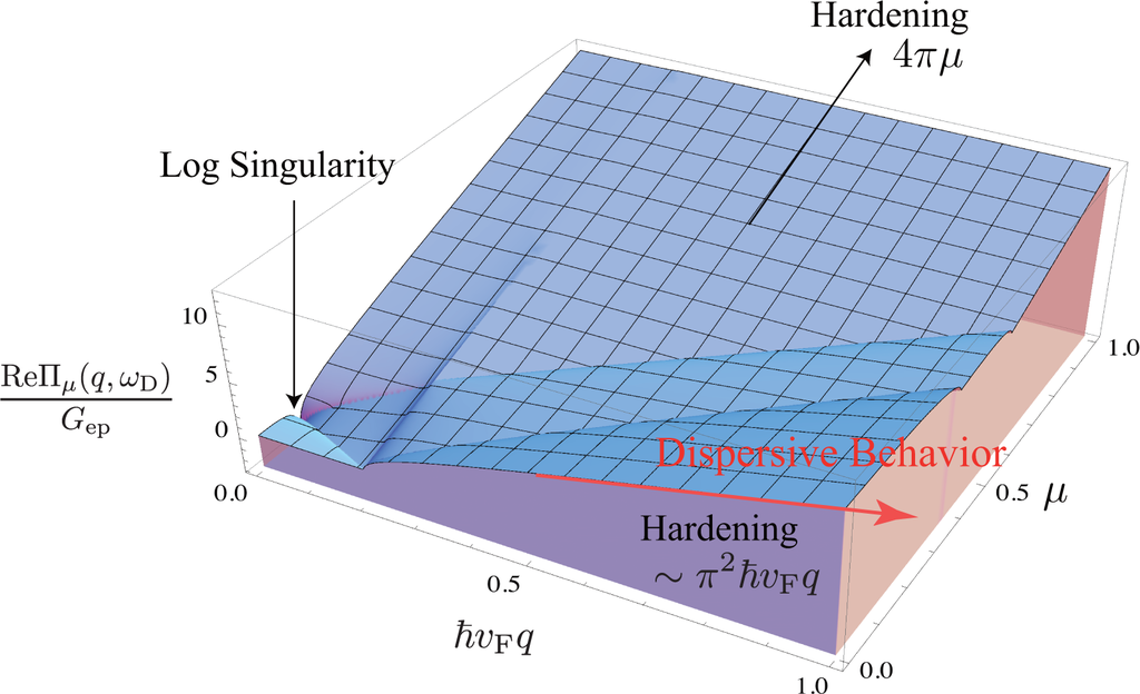 Since ħvFq ≃ EL, the self-energy contributes to the dispersive behavior of the D (or 2D) band [9,12,29,30,33]. If we use Gep = 5 cm−1/eV, which is obtained from the broadening data published by Chen et al. [3], the self-energy can account for ∼60% of the dispersion because ReΠμ≃0(q, ωq)≃Gepπ2EL and Gepπ2 ≃ 30 cm−1/eV. It should be emphasized that the self-energy is calculated using only Equation (10), and any artificial assumption, such as an adiabatic approximation, is not employed when calculating the self-energy. The physical origin of the dispersive behavior is easy to be understood with shifted Dirac cones [31]. In perturbation theory, the mechanism of dispersive behavior is almost the same as the mechanism where the G band exhibits hardening with increasing |μ|.
