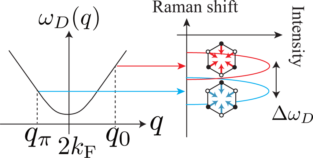 For simplicity, let us assume that the phonon dispersion relation for the D band is isotropic about the Dirac point. From Figure 7 it is clear that the two phonon modes with q0 and qπ have different phonon energies, which results in the double peak structure of the D band. The difference between the energy of the phonon mode with q0 and that with qπ is approximated by