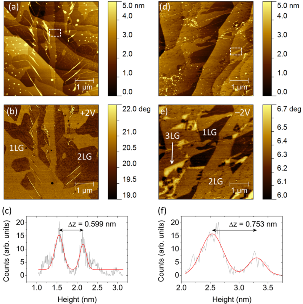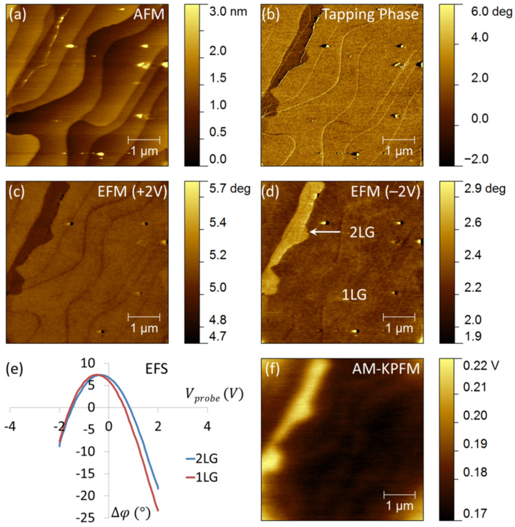 Series of images from the same region showing 1 LG with a small 2 LG island: (a) topography; (b) tapping phase showing 1 LG and 2 LG regions; (c) EFM phase at Vprobe = +2 V; (d) Electrostatic Force Microscopy (EFM) phase at Vprobe = −2 V; (e) Electrostatic force spectroscopy (EFS) curves for the 1 LG and 2 LG; (f) Kelvin Probe Force Microscopy (KPFM) surface potential map.