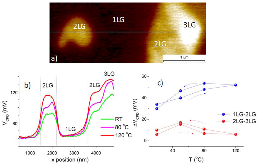 (a) Room temperature AM-KPFM image of graphene on SiC(0001) showing 1 LG, 2 LG and 3 LG domains; (b) Linear profiles of the surface potential difference at room temperature (RT), 80 and 120 °C along the line shown in (a). Vertical dotted lines show the approximate boundaries of domains; (c) Temperature dependence of the change of the surface potential difference obtained using histogram analyses of subsequent surface potential images for 1 LG–2 LG and 2 LG–3 LG domains. The arrows show directions of the temperature change. The solid lines are guides for the eye.