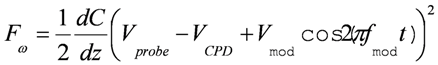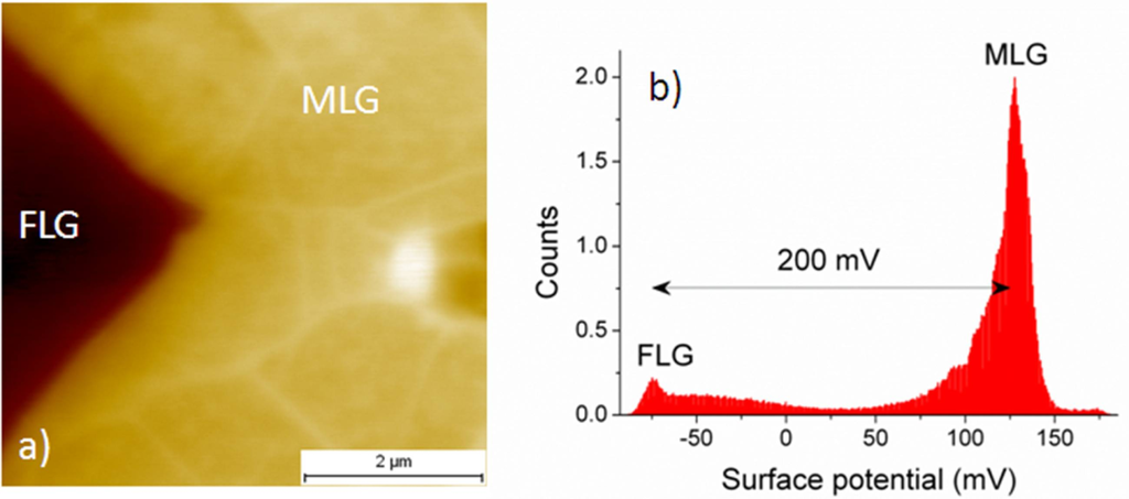 Besides the production of large-areas of graphene, forthcoming industrial needs require a large-scale contactless method for testing its electrical properties. Currently, only time-consuming, complicated and expensive electrical properties measurement methods of graphene are available, including patterning of devices and subsequent transport measurements. In this case, the obtained information is generalized over the whole device and not correlated with the exact morphology of graphene and presence of structural defects or local adsorbates. Electrical modes of SPM, for example Kelvin Probe Force Microscopy (KPFM) [14,15], Electrostatic Force Microscopy (EFM) [16], and Electrostatic Force Spectroscopy (EFS) [17] have recently been successfully used to identify the number of layers in epitaxial graphene. These techniques provide a contactless (and, therefore, simple, cheap and widely accessible) electrical mapping of epitaxial and exfoliated graphene allowing to extract crucial information about graphene thickness, distribution of the electrical potential and charge, work function, etc. on the nanoscale. While the EFM method allows mainly qualitative mapping of the surface potential [7,18,19,20], the KPFM technique provides quantitative values for the work function difference, Φs = Φprobe – eVCPD, where Φs and Φprobe are work functions of the surface and probe, respectively, and VCPD is the contact potential difference directly measured by KPFM. Using KPFM method, both exfoliated [21] and epitaxial [22,23,24] graphene with different number of layers has been studied by various groups. In epitaxial graphene grown on SiC, the method has proved to be useful for easy identification of graphene domains.