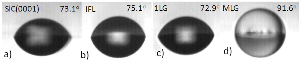 Contact angle measurements. Water droplet on (a) SiC(0001) substrate; (b) interfacial layer (IFL); (c) 1 LG and (d) MLG.