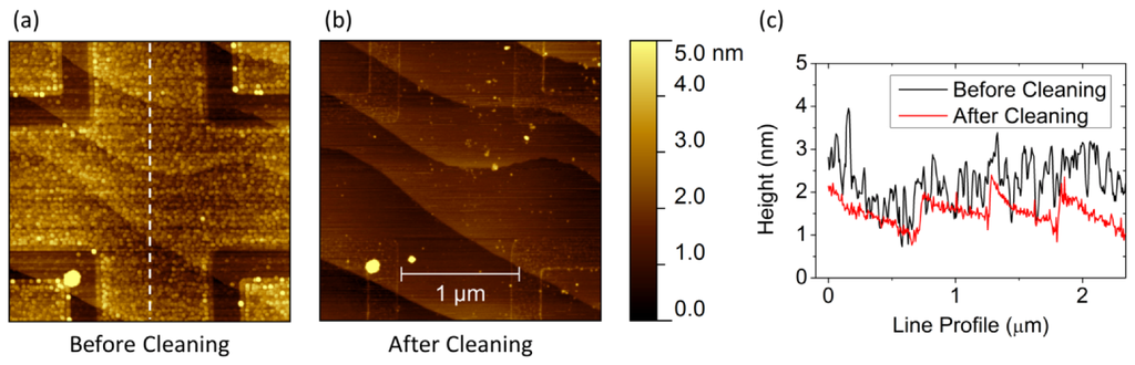 Topography images showing device #3a, (a) before and (b) after CM-AFM cleaning; (c) The line traces for each image along the dashed white line as indicated in (a).