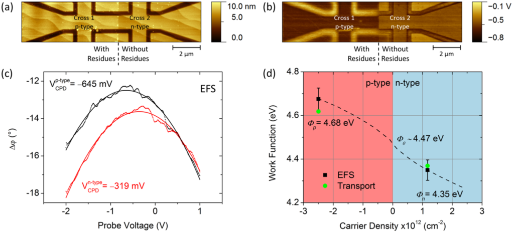 As discussed above, the presence of resist residues has a profound effect on the electronic properties of graphene, such that the conduction mechanism is hole driven. Complete removal of the resist residue from a part of the device using CM-AFM, allows us to fabricate a unique planar p-n junction on epitaxial graphene (device #3b: left part—p-type, right part—n-type, Figure 10a,b). Transport measurements revealed cross 1 to remain p-type, while the cleaned cross 2 showed the n-type behavior (Table 3). For both types of doping, carrier concentration and the expected EF were comparable.