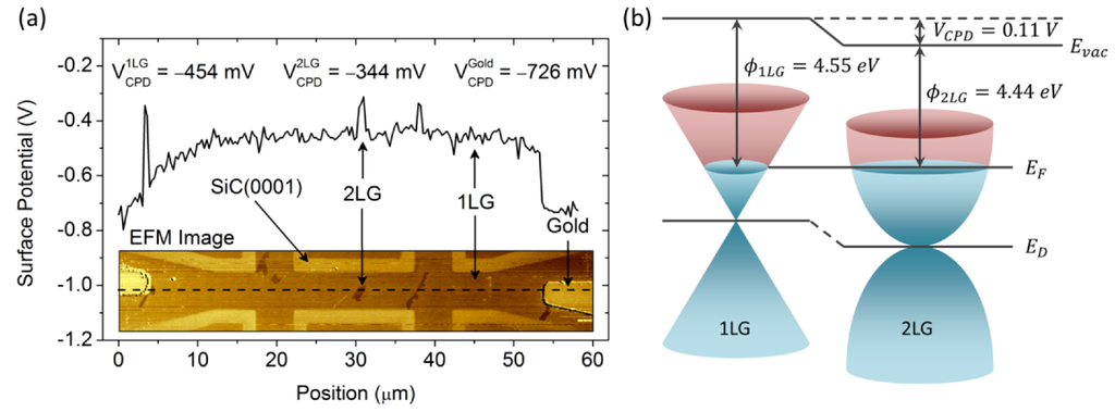 The work function measured with KPFM and EFS is directly related to the carrier concentration of the graphene and, therefore, the doping level is fundamental to the measured surface potential. There is a large range of VCPD values reported in the literature (Table 4, Section 2.4.3) as can be expected based on intrinsic doping alone. Even an explicit and detailed knowledge of the substrate-related doping does not necessarily guarantee a reasonable agreement with the experimentally measured carrier concentration in the graphene. The level of doping is also dictated by the geometrical relationship of the graphene to the substrate. In exfoliated graphene it has been shown that the closer the graphene is to the substrate the greater the charge interaction between them, with annealing improving the graphene-substrate conformity. An undetermined roughness is not expected in the case of epitaxial graphene, as the IFL and graphene grow directly on the atomically flat SiC surface. Nevertheless, domains of different layer thickness have an ‘intrinsic’ roughness [56], which is likely to influence the graphene-IFL-substrate interaction. Substrate steps also influence the charge interaction, where the terrace width and height are both dependent on the exact growth conditions [57] and the miscut of the original SiC crystal [58]. It was shown that when the graphene passes over a terrace edge, a detachment of the graphene from the substrate is possible leading to an abrupt change in local doping [59], which can be seen with KPFM and EFM as a change in the potential (Figure 2). However, this effect should be distinguished from the possibility of narrow MLG bands nucleating at the terrace edge [60]. Other structural features and defects that are found on epitaxial graphene (e.g., puckers formed due to the thermal coefficient of expansion mismatch between the graphene and the substrate [61]), also have an appreciable effect on the electrical properties. Such defects have been shown to strongly influence the device properties depending on whether the alignment of the devices crossed the wrinkles perpendicularly or were parallel to them [62].