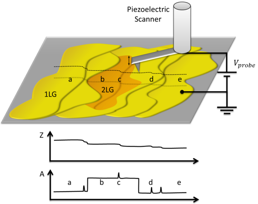 Scanning Capacitance Microscopy (SCM) operates at microwave frequencies and has found widespread use in the analysis of dopant profiles in semiconductor materials [46,47]. SCM has been applied to the mapping of graphene in numerous instances and in slightly different ways. SCM has the ability to distinguish between different layer thicknesses of graphene and can also show further contrast within graphene domains. Different implementations have been used, for example, where the air-gap between the SPM tip and the graphene forms a metal-dielectric-metal series capacitor [48]. Alternatively, the tip-graphene forms the top electrode connected to the dielectric/semiconductor with the back gate (i.e., bottom electrode) being formed by heavily doped silicon substrate or additional metallic layer [49]. Lately it has been shown that using graphene in contact with the AFM tip as the top electrode provides a way of determining the mean free path in graphene as a bias is applied to the graphene for a finite period thus determining the area of the top electrode [50]. In each case the techniques involves significant analysis and de-convolution process is required to characterize the graphene individually as part of the whole measurement system. Currently there is still a relatively limited amount of work on the application of SCM to graphene and further systematic studies are needed to develop confidence in the technique when applied to graphene.